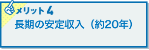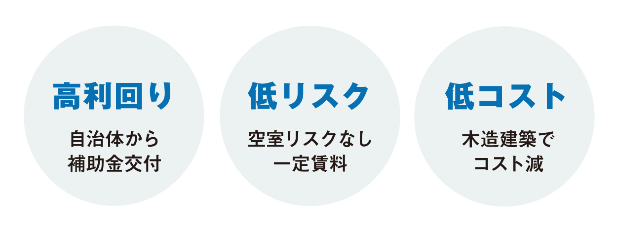 運営会社との賃貸契約は約20年の長期契約で、賃料も長く固定されます。長期契約ですので、建築時に借り入れをする場合でも無理のない返済計画を立てることができます。運営会社には行政から運営費が支給されるため、家賃滞納のリスクも低く、契約満了後には再契約になる見込みもあります。