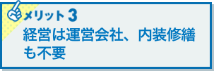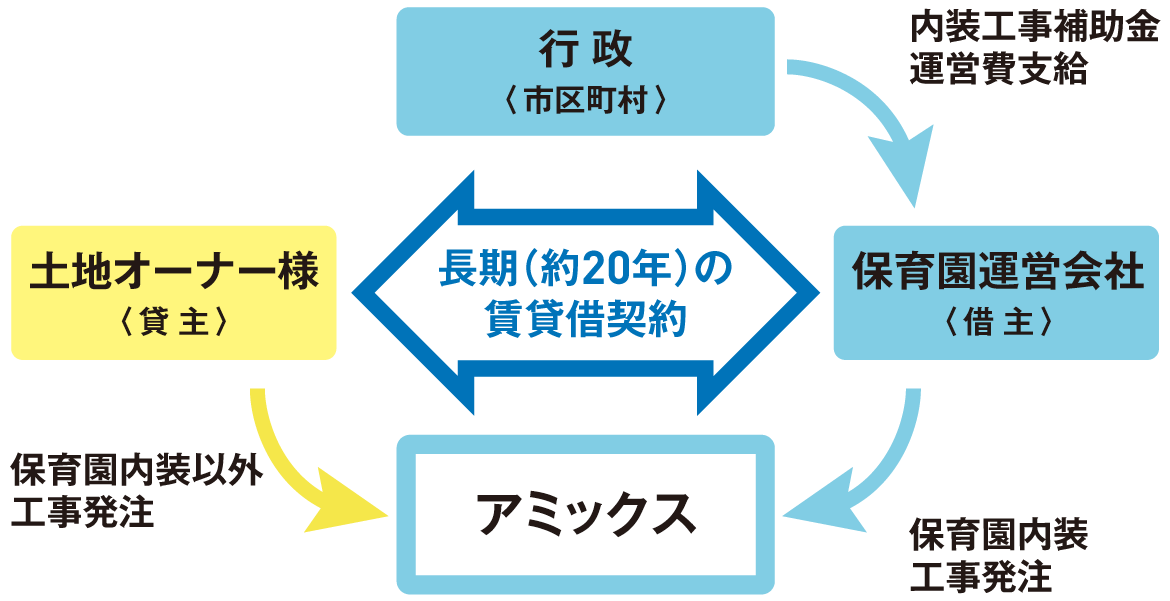保育園建築後は運営会社に貸与するため、オーナー様が運営等にかかわることはありません。また、アミックスがいままでにご紹介している運営会社は、補助金のあるなしにかかわらず建物の内装費を出資してきています。内装の修繕費も不要となり、オーナー様は投資コストを低減することができます。