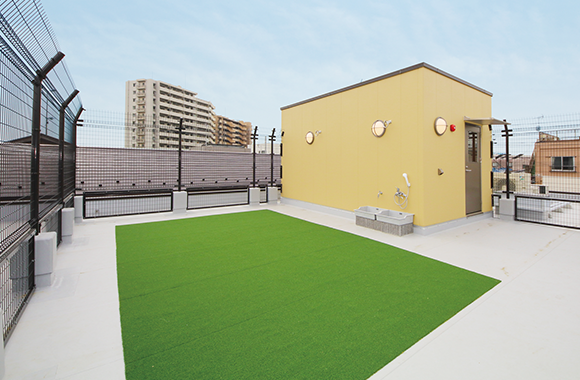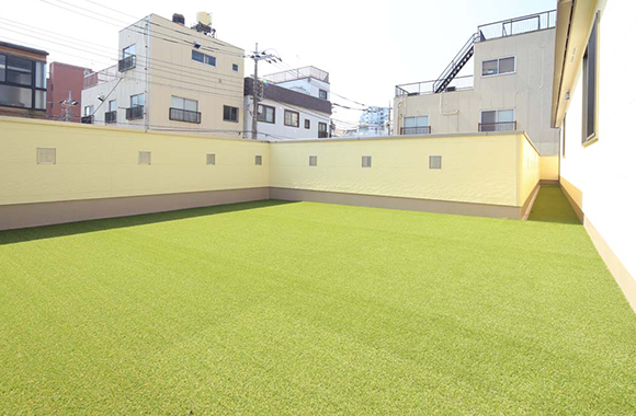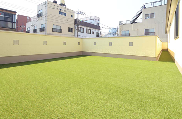 園舎の2階部分からつながる園庭に、やわらかい人工芝を設置しました