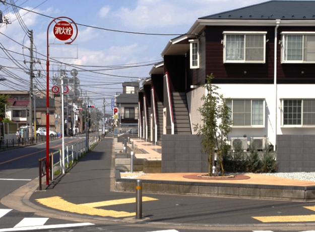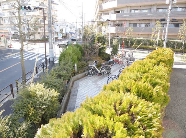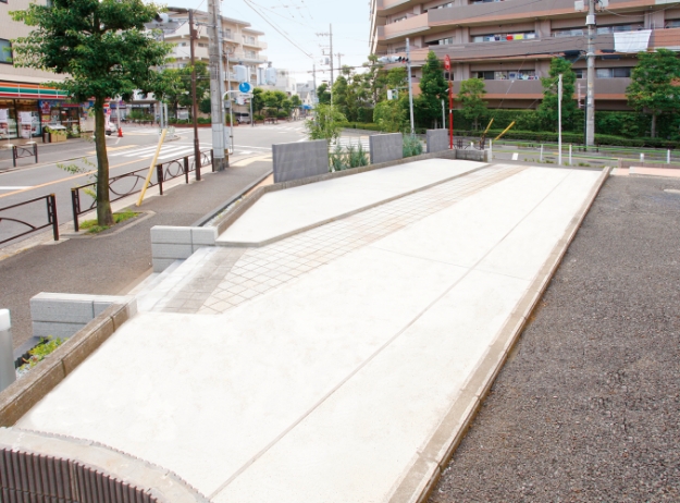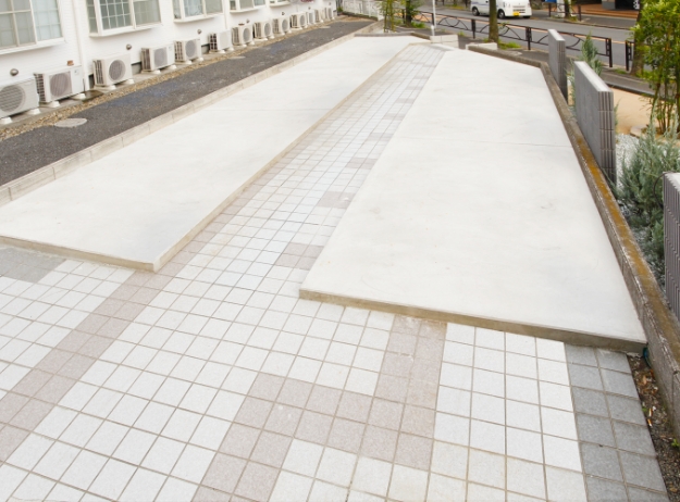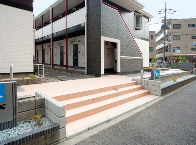 こちらのアパートには広い駐輪場がありましたが、植栽がスペースを塞いでいました。今回のリフォームでは植栽の撤去とともに歩道から乗り入れるスロープを設置、広さを活かした使いやすい駐輪場になりました。