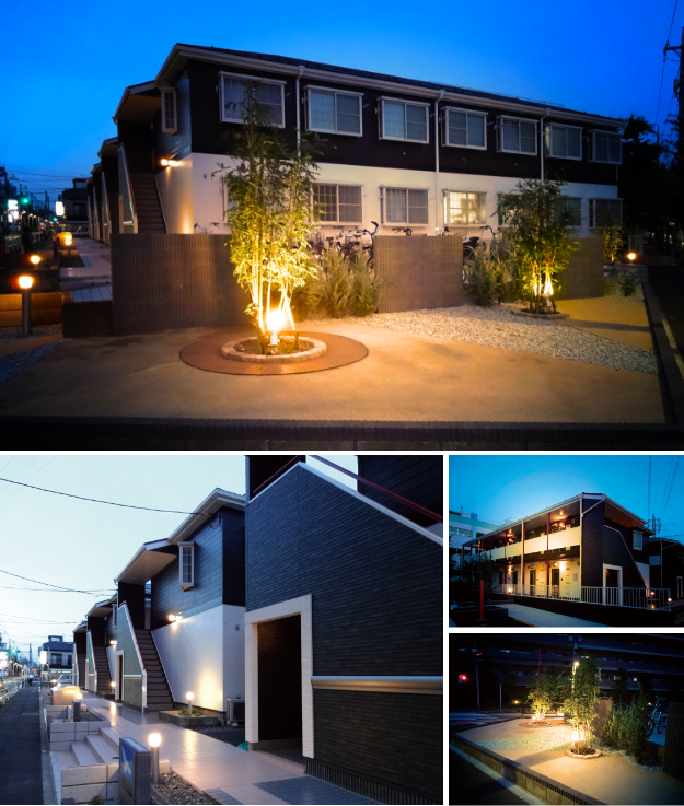 外壁や屋根、階段部分、廊下などの塗り替えにともない、ご希望により建物全体の配色の変更も可能です。外装とともに門扉や駐輪場、植栽の整備やライトアップなど採り入れた外構工事を行うことで、新築物件と見間違うほど印象が変わります。