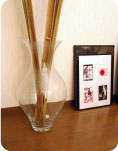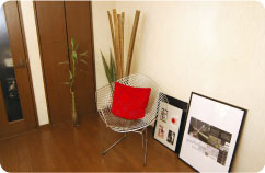 ふんわりとした間接照明とこだわりの小物たちで、シンプルにすっきりとまとめた部屋。モダン家具と竹などの植物とを合わせ、無機質になりがちな“モダン”の中にも“なごみの和”を表現されています。