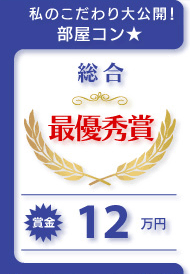 一人暮らしの男性の部屋とは思えない、素敵な部屋ですね♪壁の前の床にポン・ポンと花瓶を置いて部屋に広がりを感じさせるなど、空間を上手く使っています。照明・家具・配置などすべてが絶妙なバランスで高得点! 審査員全員一致で最優秀賞となりました。