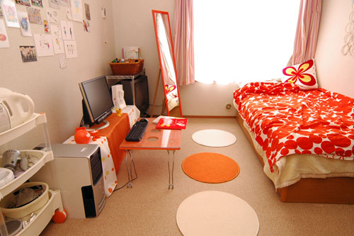 全体がオレンジで統一された、女の子らしい部屋。カタチにもこだわって丸いものが並んでいます。壁にはお気に入りのポストカードが貼られ、さすが美大出身のデザイナーさん! という感じですね。