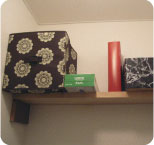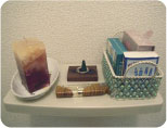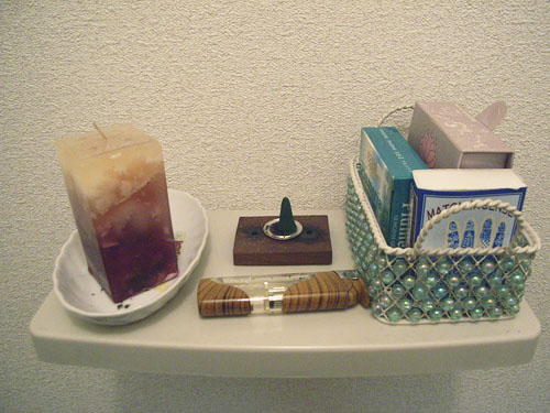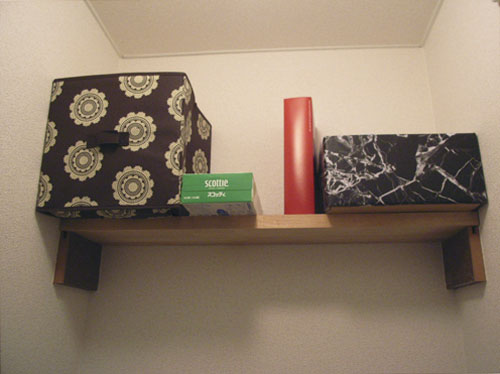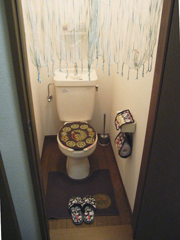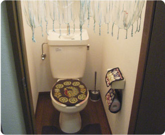 このアパートに引っ越してきたばかりで、エスニックが大好きというSさん。「まずトイレから凝ってみました。」トイレカバーやペーパーホルダー、スリッパもエスニック柄で統一。雰囲気のあるのれんも含め、すべて輸入雑貨店で揃えたそうです。トイレ内の棚にはお香も置かれて、いい香りがしていました。