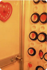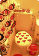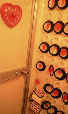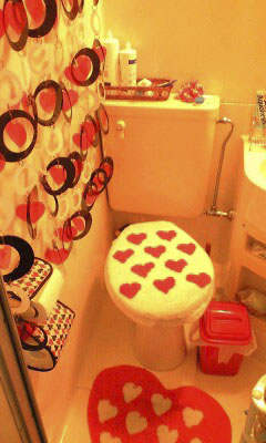 どこもかしこも赤いハートだらけ。ところせましとハートマークが並んでいます。でも、ひとつひとつのハートマークに個性があり、見ていると楽しい気分になってきます。こんなトイレやお風呂に入るのもいいかも・・・。元気なYさんらしいインテリアですね!