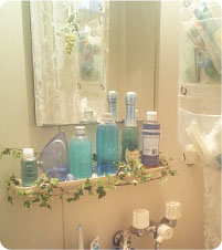 シンプルなユニットバスルームが、ふんわりとした癒しの空間に大変身。緑やレースを上手に使っていらっしゃいます。毎日のバスタイムが楽しみなバスルームですね!