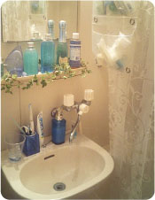 白いレース柄のカーテンや、緑の小物をあしらった優しい雰囲気のユニットバスルーム。並べられた化粧品類も青い色で統一されていて、全体的に透明感があります。まるでリフレクソロジーのお店のようで、ここでゆっくりできたらいいなと思えるような、リラックスできる空間になっていますね。