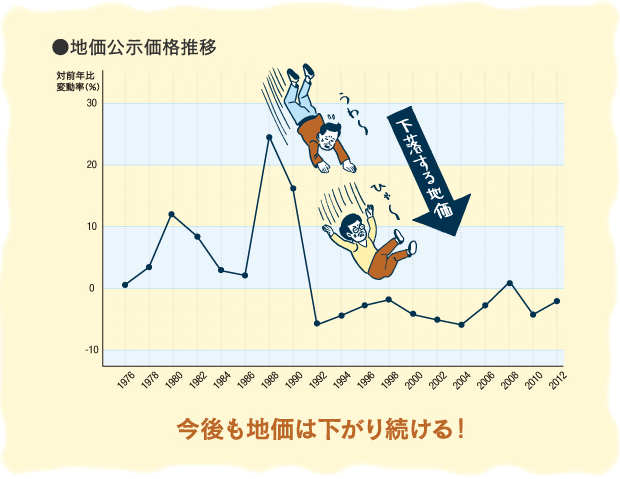この先も地価上昇を見込める状況にはなく、残念ながら今後もじりじりと下がり続けるでしょう。場所によっては、大きく下がってしまうことがあるかもしれません。
