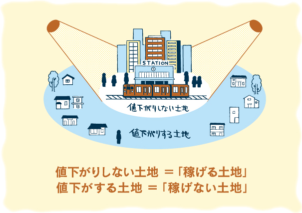 値下がりしないのは、東京都心を中心に駅から近い住宅地のほか、首都圏の繁華街などになるでしょう。このような場所であれば、オフィスや店舗、住宅などの需要が多いため、賃貸として安定した収益を生み出すことができます。値下がりしない土地=「稼げる土地」ということです。